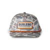 Camouflage-patterned cap with 'Burlebo Outdoors' logo on a white background